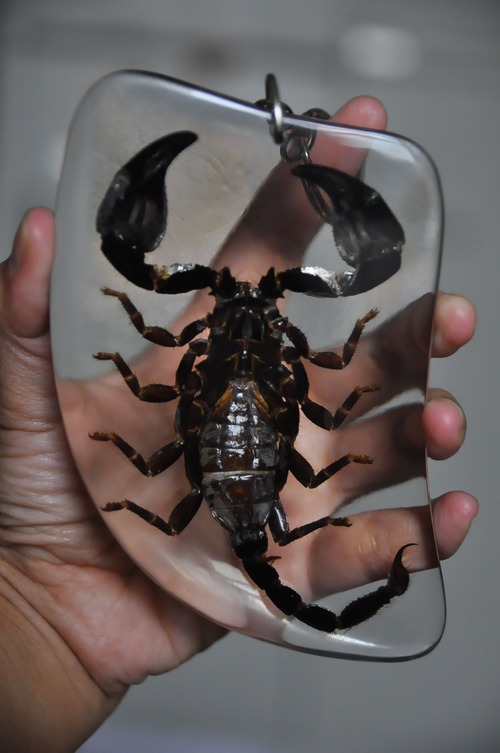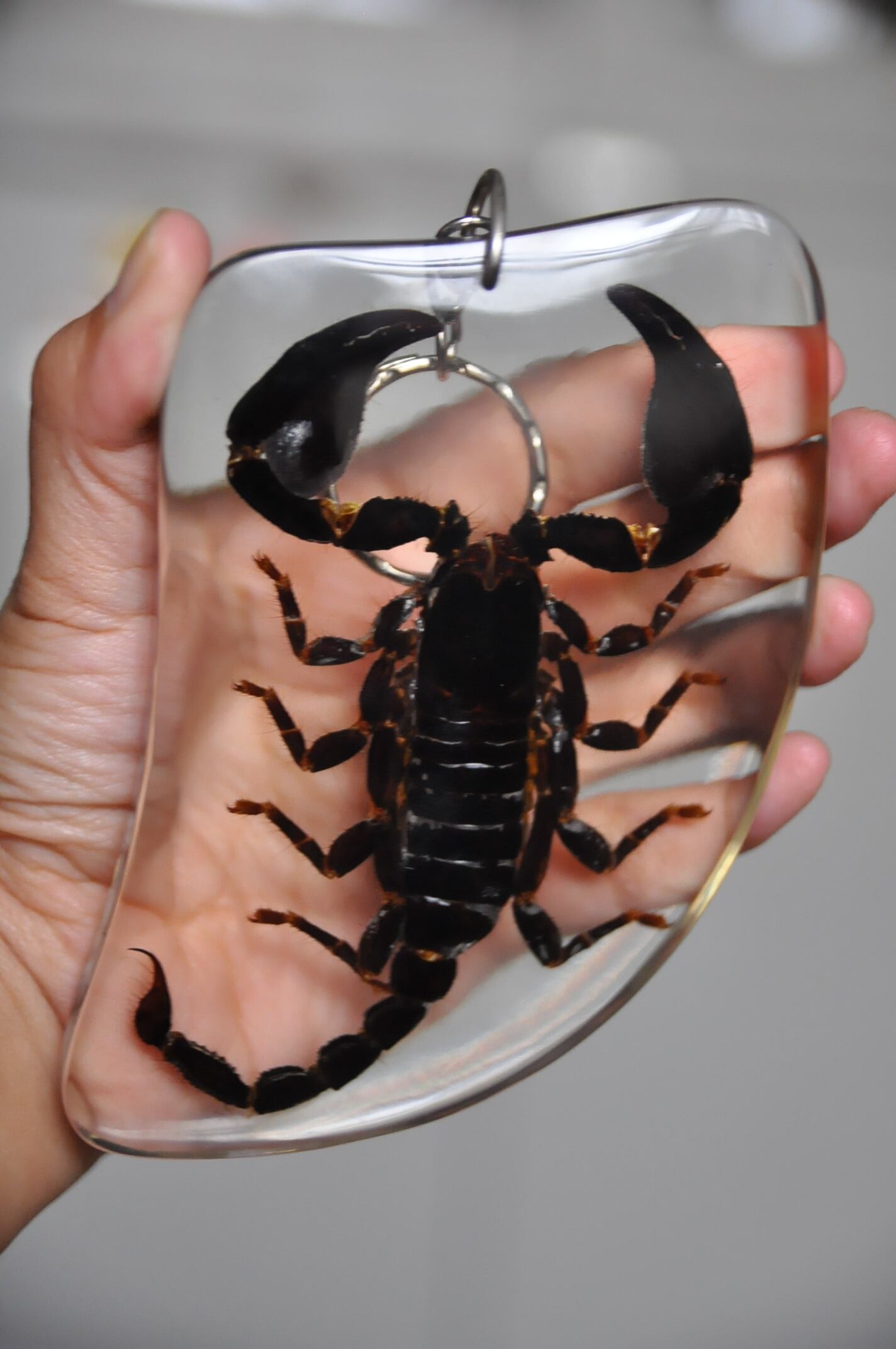 本品は本物のサソリを透明レジン樹脂に封じ込めた標本キーホルダーです。この世の危険や敵の攻撃から鉄壁の守護を受ける象徴として、ぜひあなたの側に。