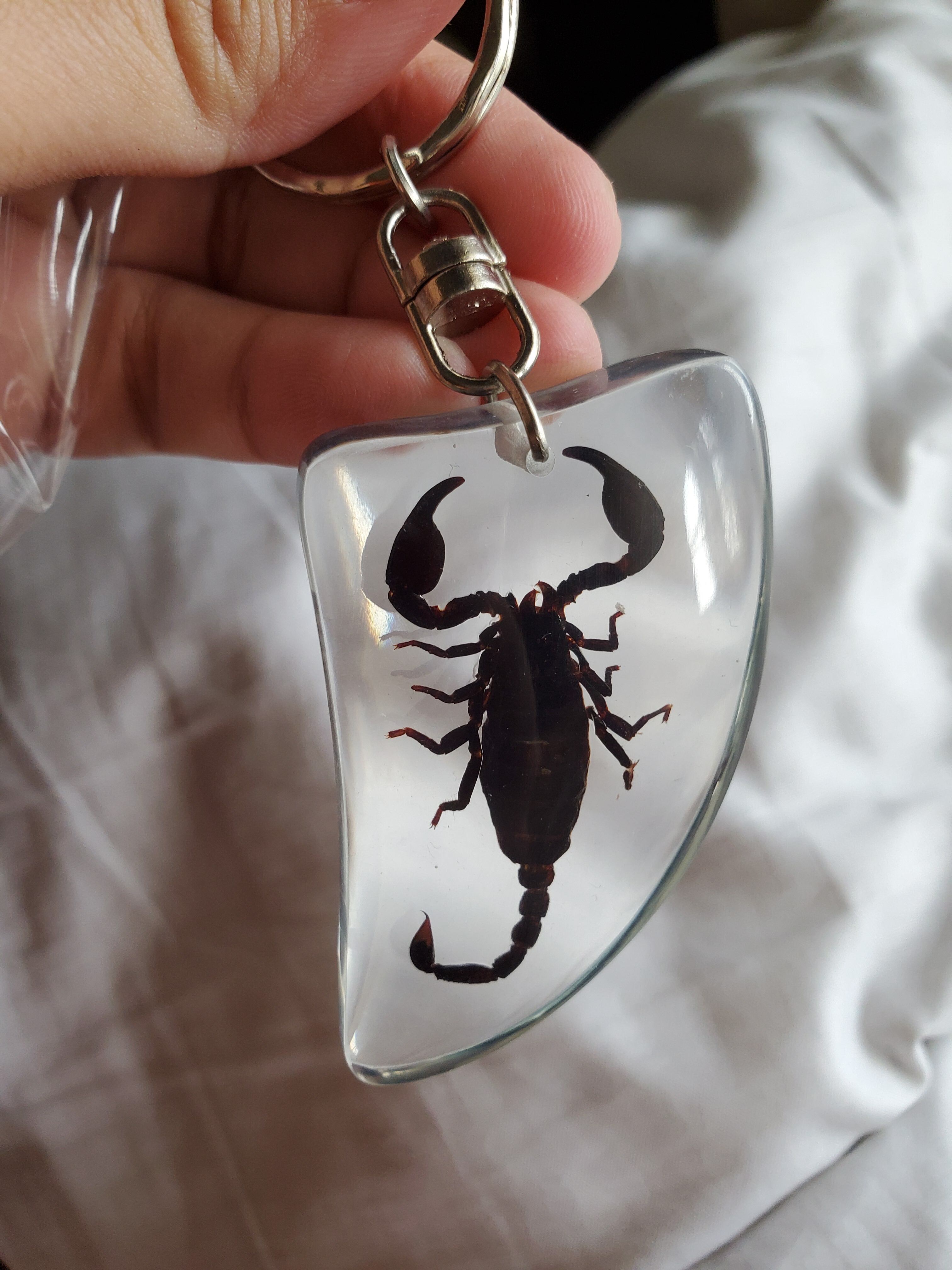 本品は本物のサソリを透明レジン樹脂に封じ込めた標本キーホルダーです。この世の危険や敵の攻撃から鉄壁の守護を受ける象徴として、ぜひあなたの側に。